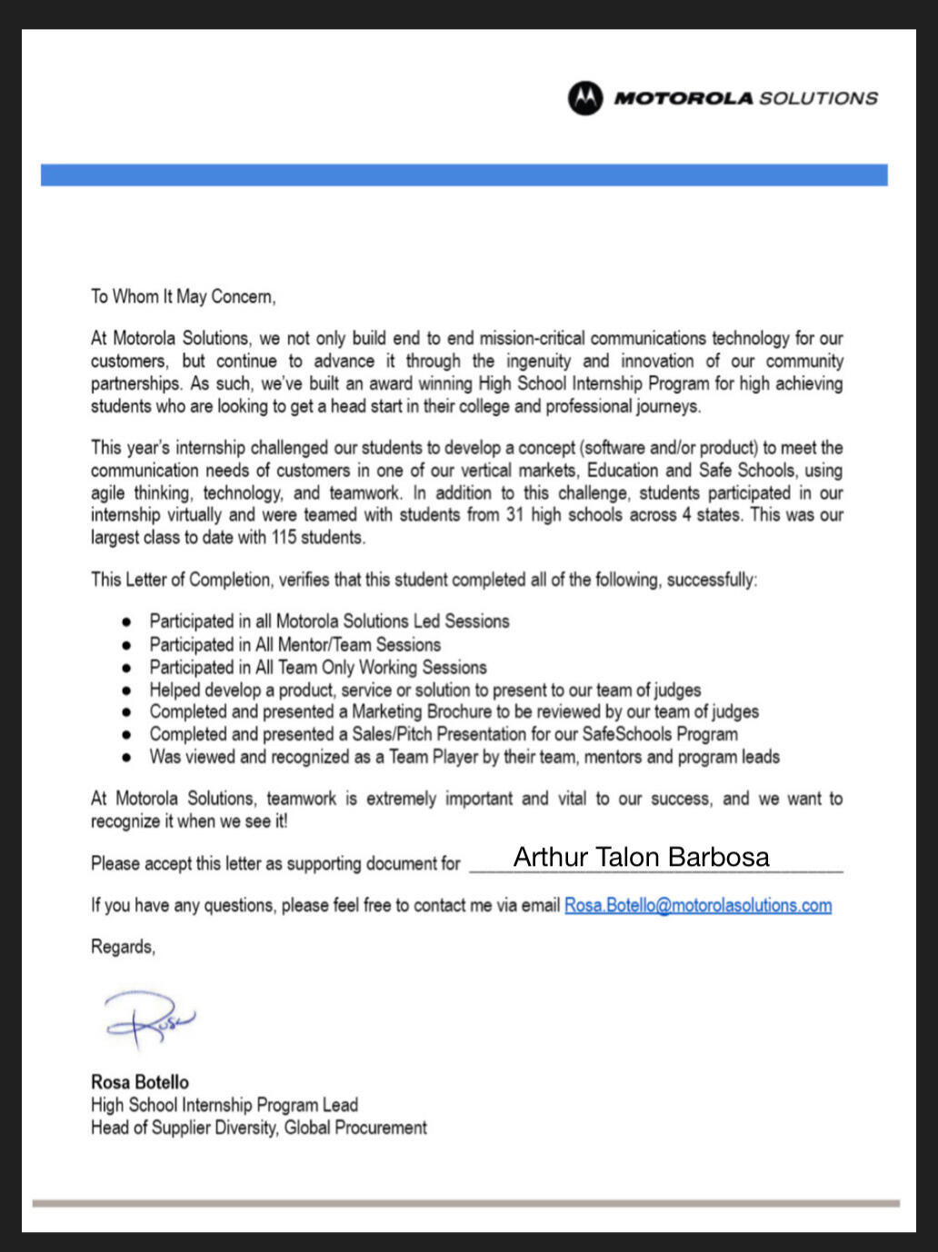 Create a solution for school safety within Motorola resources. Show case product in final evaluation with financial plan to put into market. Team placed 2nd overall; more than 100 interns participated in the program. Team overperfomed MIT and Columbia University engineers.