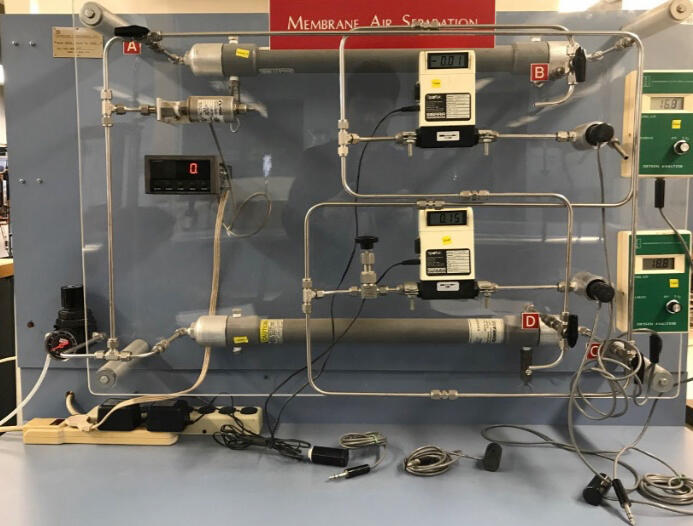 Investigated membrane gas separation by using hollow-fiber polymer membranes to separate oxygen and nitrogen from compressed air while operating the system in parallel and series configurations. The purpose was to evaluate how pressure and flow rate affect oxygen permeability (QA), selectivity (α), and transport behavior, and to compare experimental results with predictions from the solution–diffusion model.
