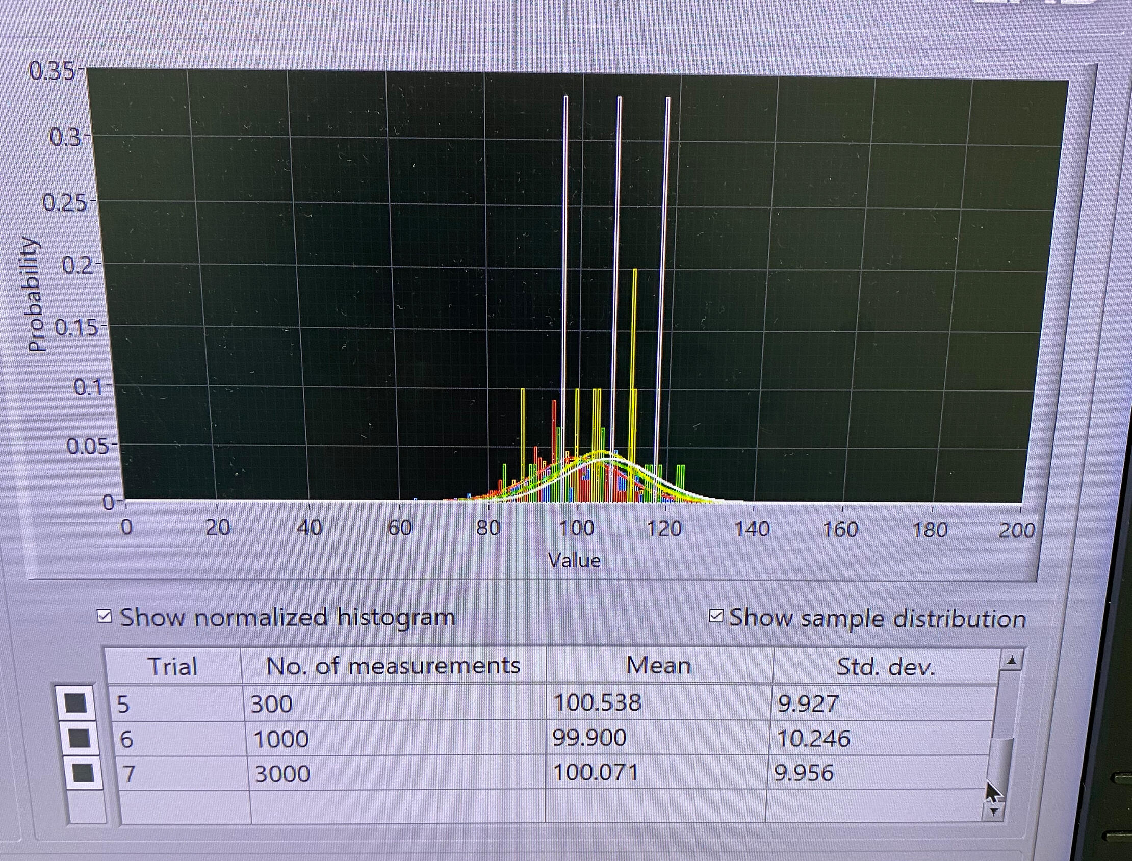 Calculated mean values, standard deviations, and total uncertainties for repeated measurements to determine best estimate values and assess measurement precision. Histograms, normal distributions, and error-bar plots were used to evaluate random fluctuations, instrument uncertainty, and accuracy of the experimental results.