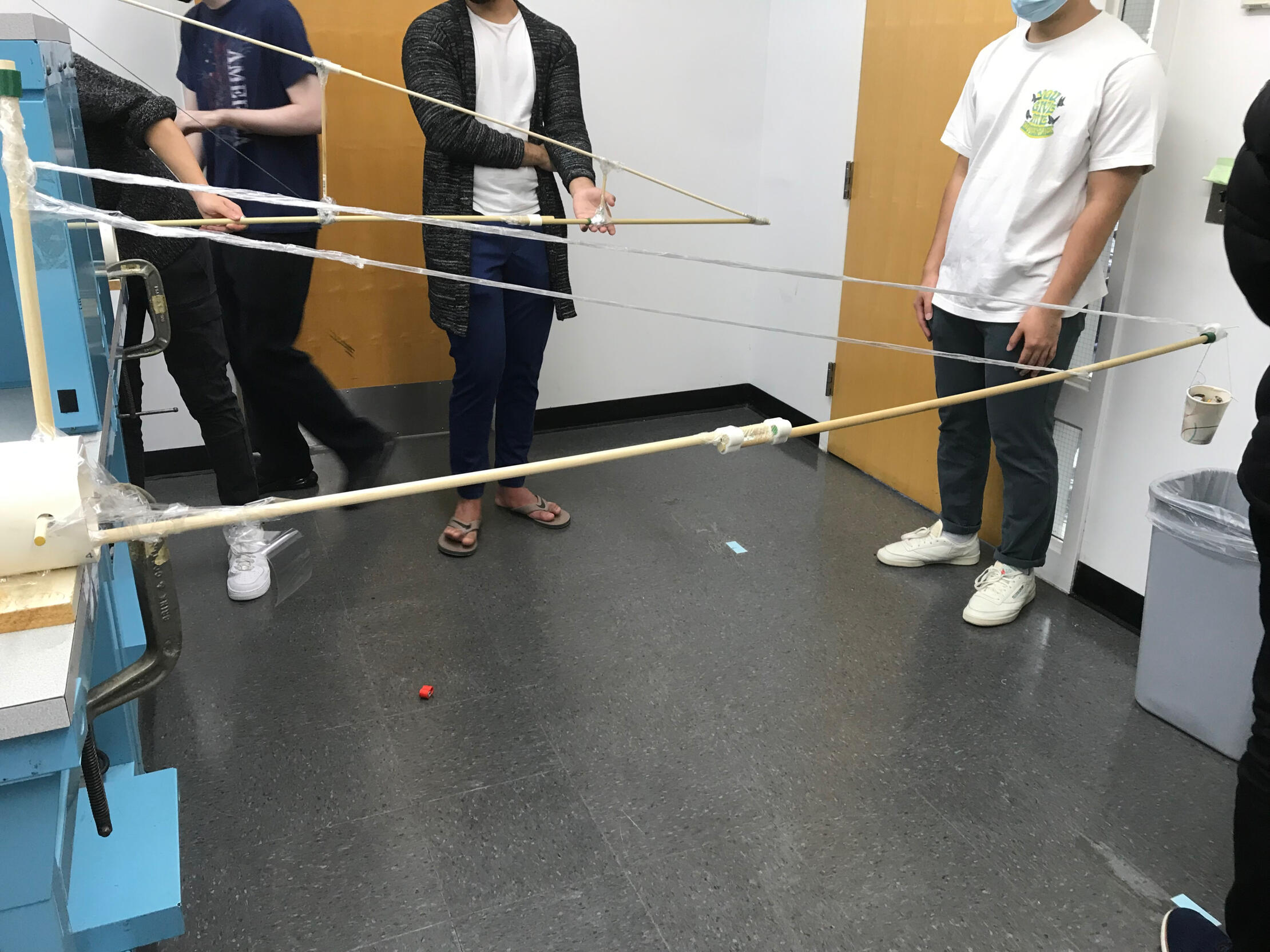 Demonstrated the physics behind cranes typically focuses on static equilibrium, torque, and tension forces acting on a rigid structure. By balancing loads at different distances from a pivot and measuring cable tensions, the experiment shows how moment arms, counterweights, and force distribution determine crane stability and lifting capacity. This illustrates why cranes use long booms, counterweights, and angled support cables to safely lift heavy loads without tipping.