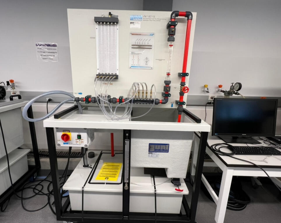 Examined pressure losses in pipe systems by measuring pressure drops across straight pipes and common fittings to determine the friction factor (λ) and drag coefficient (ξ) as functions of flow rate, diameter, material, and geometry. The results were compared to theoretical correlations to show how surface roughness and fittings (valves, constrictions, bends) dominate energy losses and influence pump sizing and system efficiency.