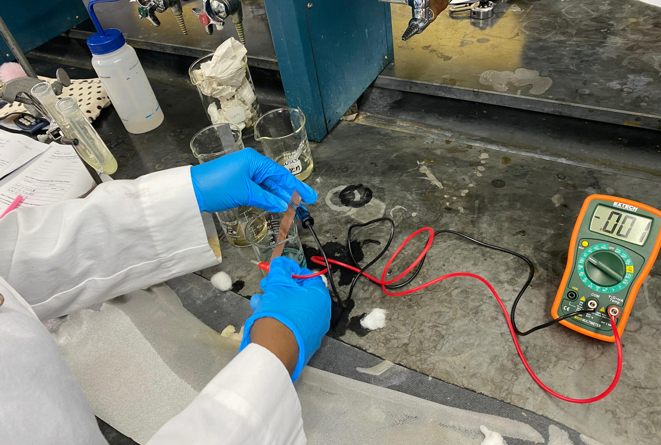 This lab examined a formaldehyde-based electrochemical battery (direct formaldehyde fuel cell) using ruthenium (Ru) and palladium (Pd) electrodes as catalysts. Formaldehyde was oxidized at the anode (catalyzed by Ru/Pd), releasing electrons to the external circuit, while a reduction reaction occurred at the cathode; by measuring voltage and current, the lab demonstrated how catalytic electrodes enable efficient fuel oxidation and conversion of chemical energy into electrical power.