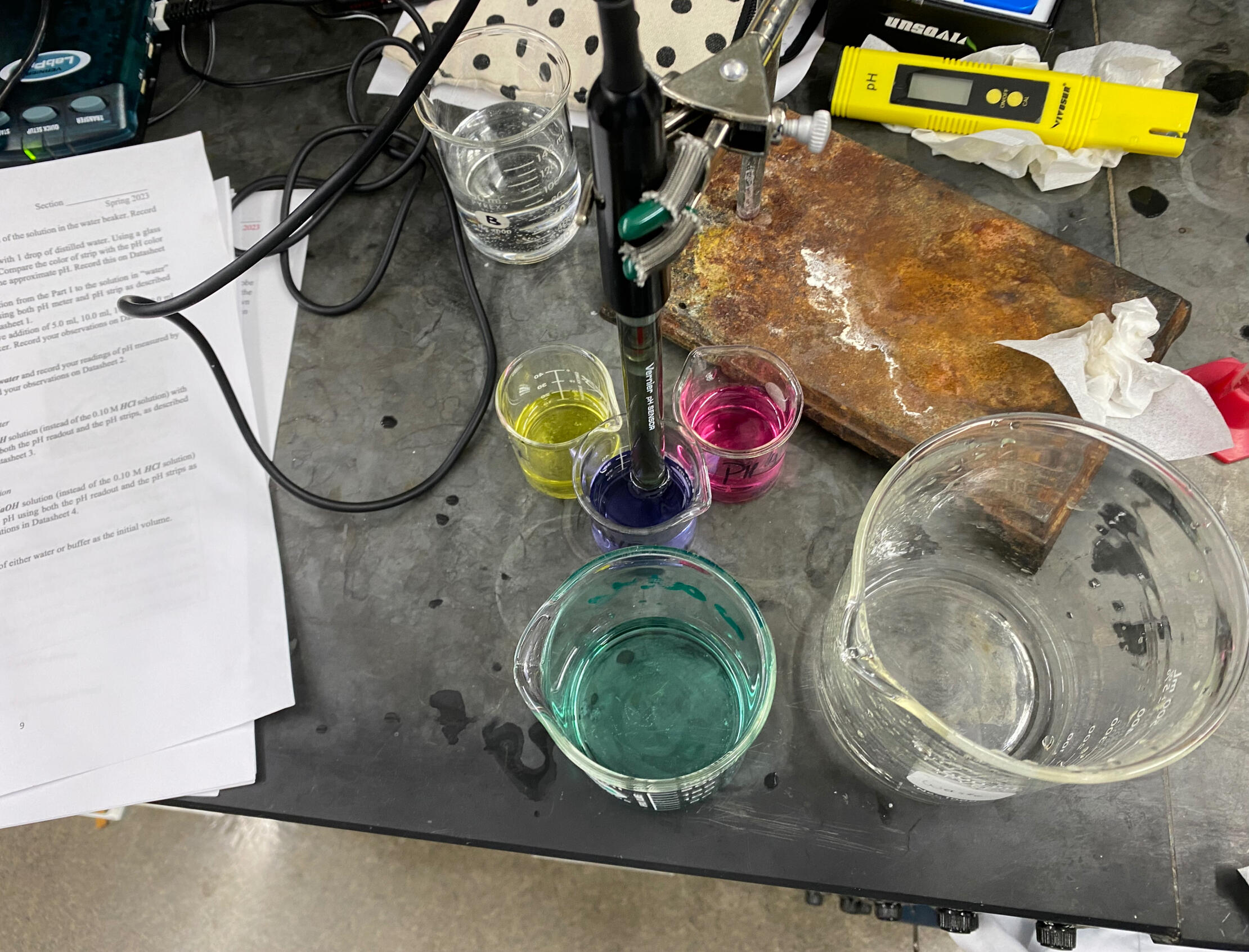 Investigated the pH scale by measuring the acidity or basicity of various common solutions using pH strips, red and blue litmus paper, and a pH meter, then comparing qualitative and quantitative results to theoretical expectations. It also examined buffer capacity and antacid effectiveness, ultimately using the collected pH data to identify an unknown solution, determined to be sprite.
