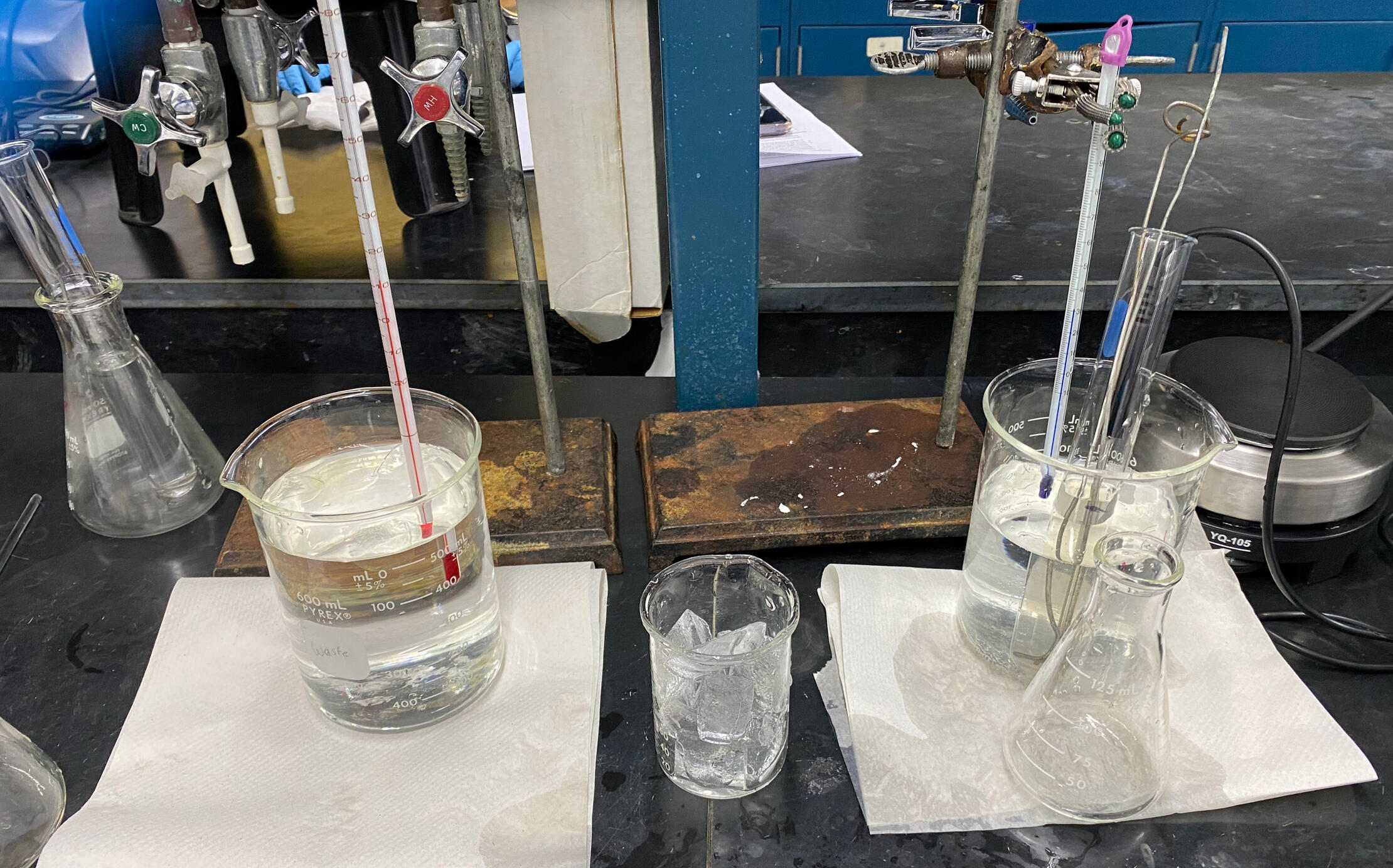 Investigated enzyme denaturation by heating an enzyme solution and measuring the resulting loss of catalytic activity. The experiment demonstrated how elevated temperatures disrupt protein structure, reducing reaction rate and showing the temperature sensitivity of enzymes.