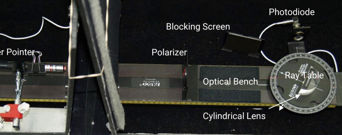 Used the reflection, refraction, and polarization of light by using a laser, ray table, and Plexiglas lens to measure angles and determine the index of refraction through Snell’s Law. It also investigated polarization by reflection by measuring reflected light intensity with a polarizer and photodiode to experimentally determine Brewster’s angle for Plexiglas.