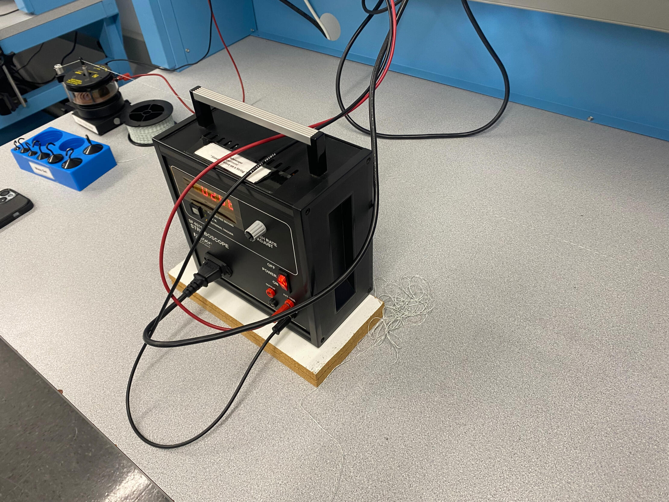 Studied standing waves on a stretched string using a variable-frequency oscillator and magnetic vibrator to excite harmonics while a stroboscope was used to accurately measure vibration frequencies. A pulley system with hanging masses set the string tension, allowing wave velocity to be calculated from measured wavelengths and frequencies and compared with theoretical values.
