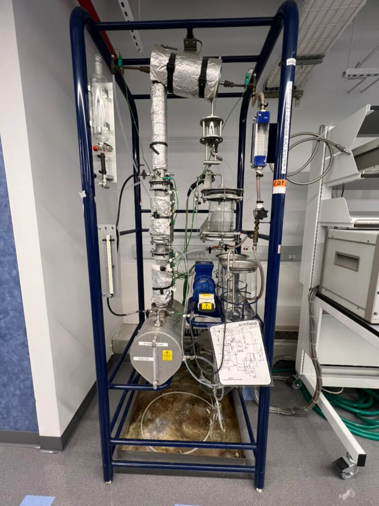 Studied about this pilot-scale distillation column that is used to experimentally determine vapor–liquid equilibrium, mass transfer, and separation efficiency under controlled reflux and feed conditions. Operating the unit reinforced how reboiler duty, condenser performance, and reflux ratio affect component separation in real chemical engineering systems.