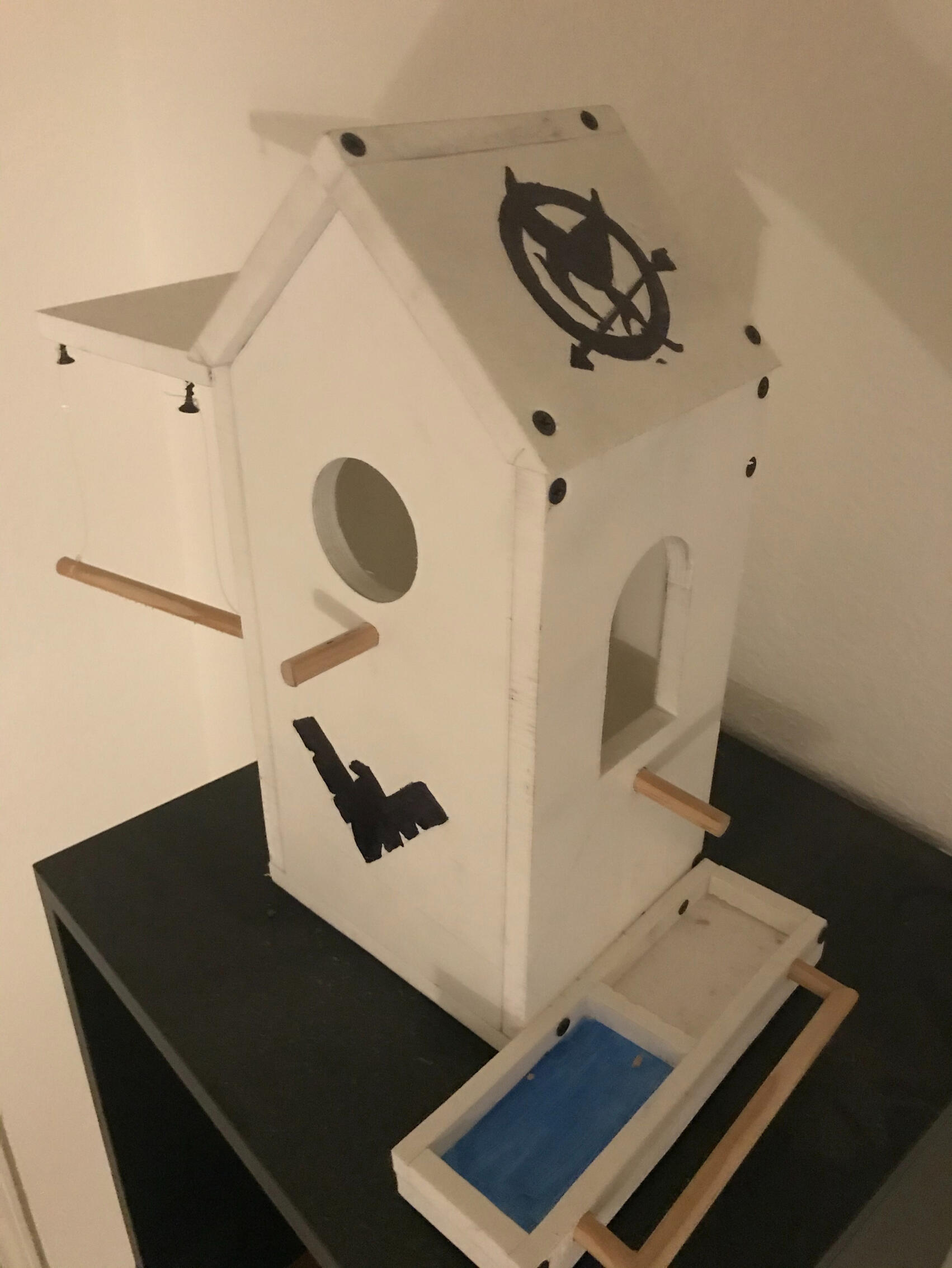The birdhouse had a place for water as well as bird food and a swing to the left side of it.