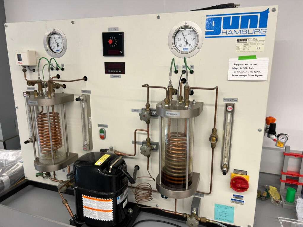 Studied how the operation of a vapor-compression refrigeration cycle, including evaporation, compression, condensation, and expansion in the Gunt ET 250. It allows students to measure pressures, temperatures, heat transfer, and system efficiency (COP) to understand real refrigeration and heat-pump behavior.