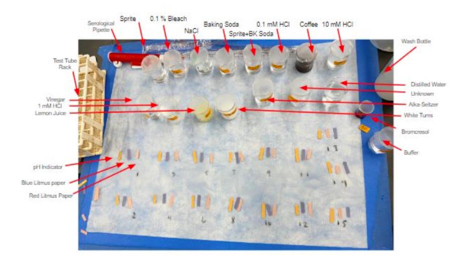 Investigated the pH scale by measuring the acidity or basicity of various common solutions using pH strips, red and blue litmus paper, and a pH meter, then comparing qualitative and quantitative results to theoretical expectations. It also examined buffer capacity and antacid effectiveness, ultimately using the collected pH data to identify an unknown solution, determined to be sprite.